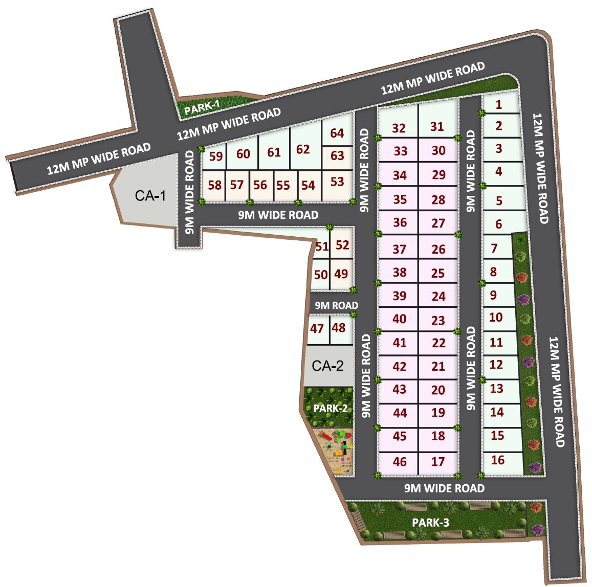 The master plan includes 64 residential plots for individual homes, complemented by three designated park areas, PARK-1, PARK-2, and PARK-3, and two community areas, CA-1 and CA-2.