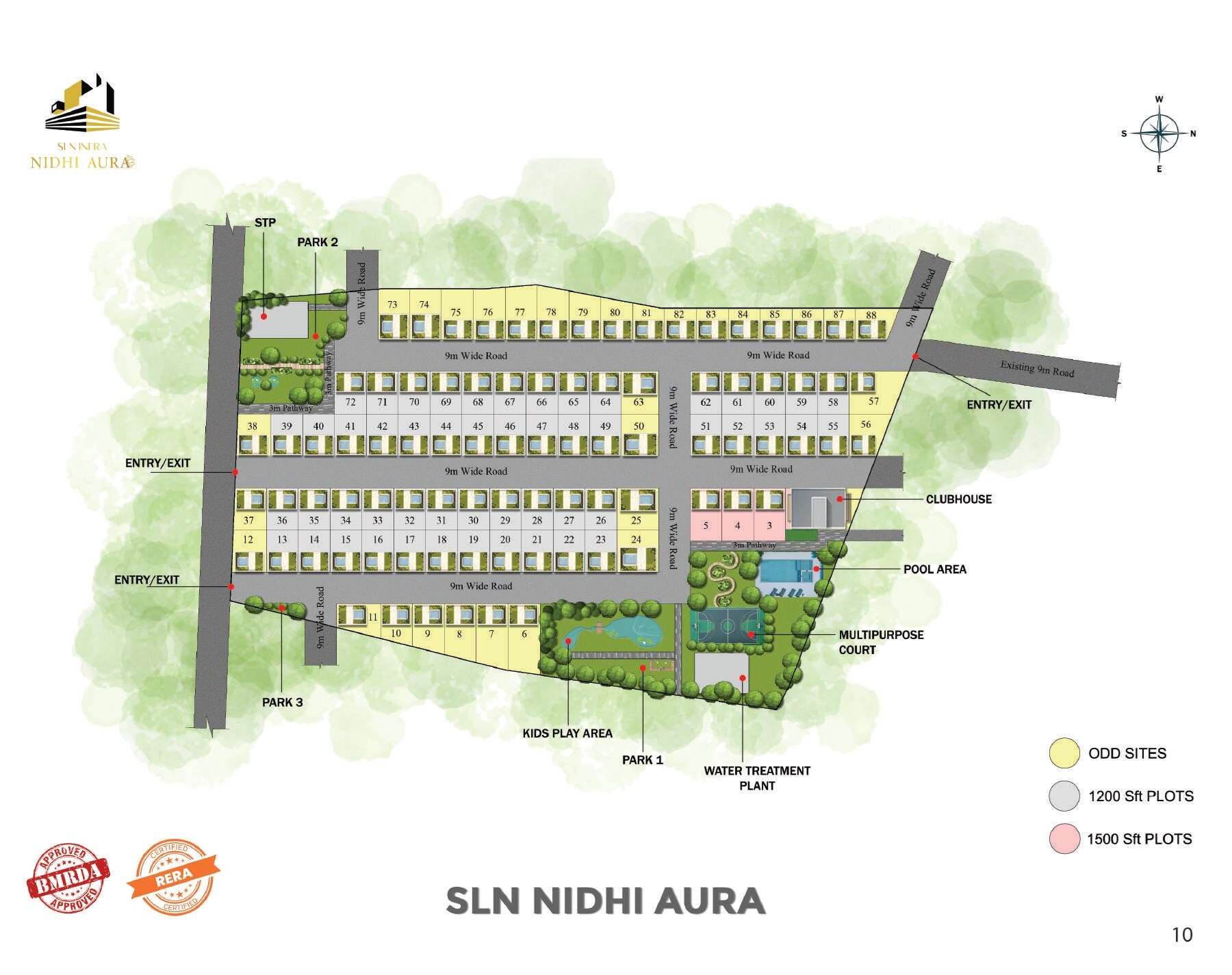 The master plan for SLN Nidhi Aura clearly designates areas for residential plots, alongside significant allocations for open spaces and community facilities. There are three identified parks, Park 1, Park 2, and Park 3, and a Kids Play Area. Centralized amenities include a Clubhouse, Pool Area, and Multipurpose Court. Essential utilities such as a Water Treatment Plant and an STP are also part of the layout. The plots are categorized into 'ODD SITES,' '1200 Sft PLOTS,' and '1500 Sft PLOTS.'