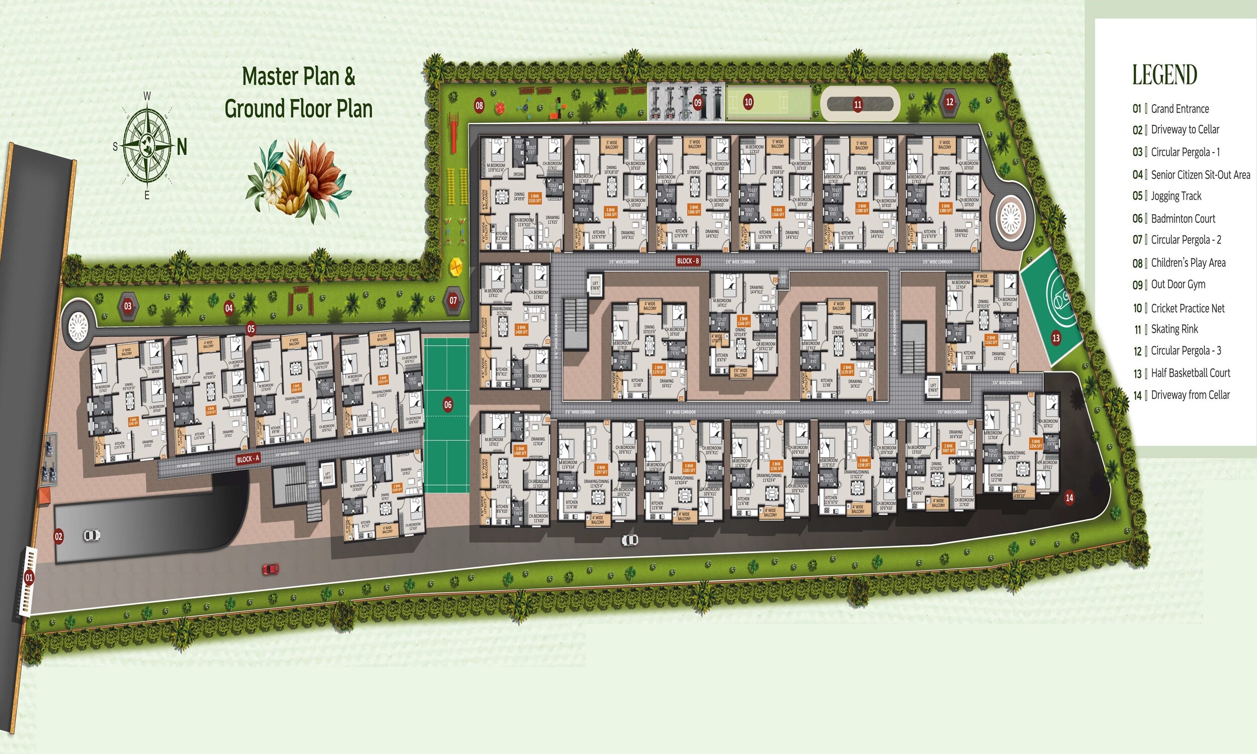 The master plan shows dedicated residential blocks surrounded by extensive green spaces that integrate various outdoor amenities for residents.
