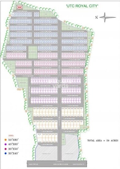 The master plan for UTC Royal City encompasses a total area of 50 acres. The development primarily consists of residential plots, with no specific number of units or towers indicated, nor are there any project launch or completion dates visible on the plan.