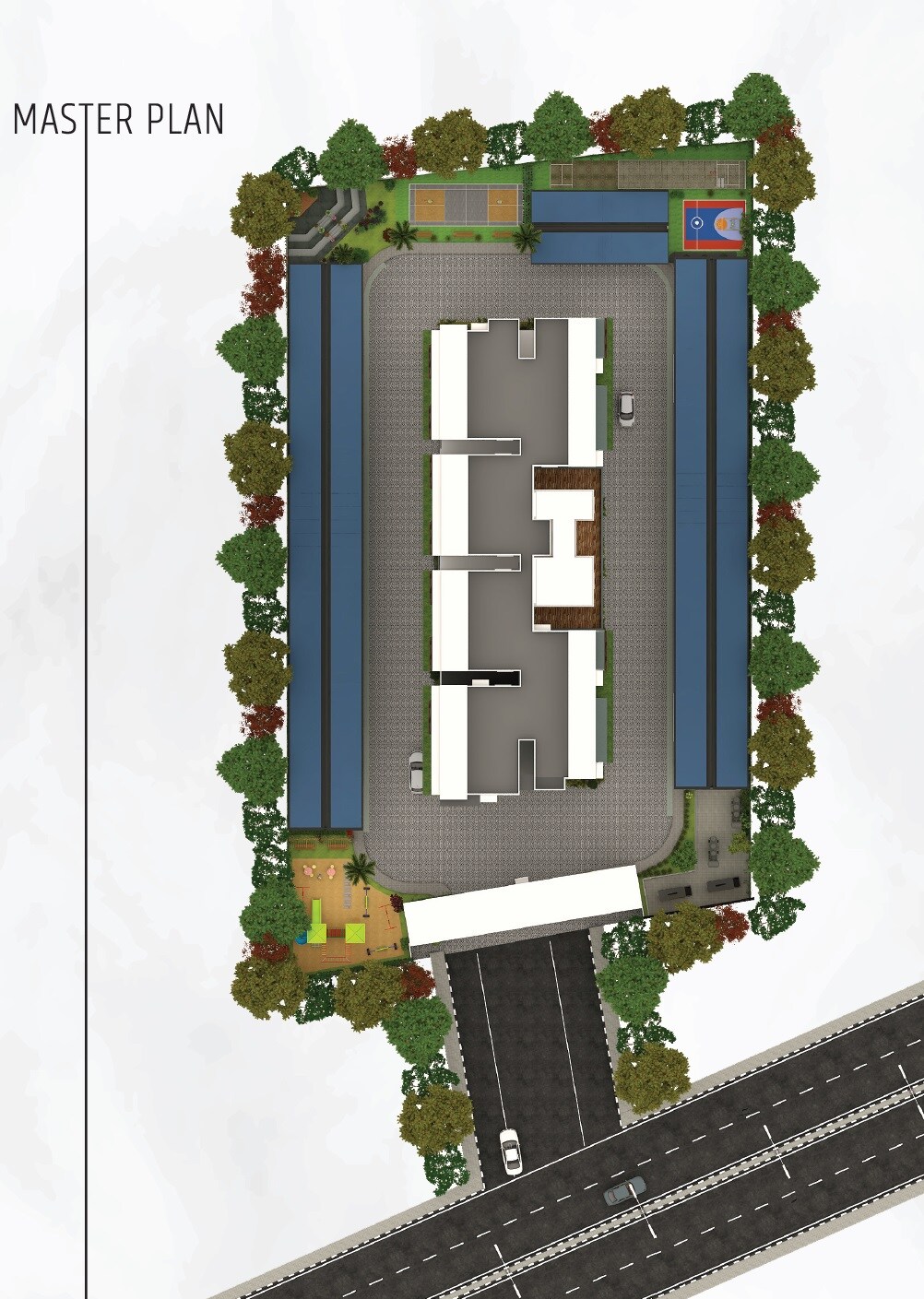 The master plan designates areas for residential use, extensive covered and open parking, recreational facilities, and significant green spaces and landscaping along the perimeter. Residential blocks are centrally located, flanked by parking, with amenity zones at the north and south ends.