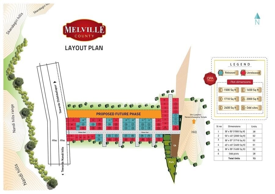 Wellnest Melville County, situated near Nandi Hills, features a layout with a total of 73 units. The master plan indicates various plot sizes and includes a 'Proposed Future Phase' for further development.