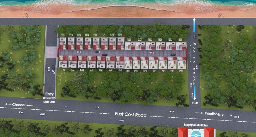 The master plan features residential villas bordered by green spaces, with direct adjacency to the East Cost Road and a private path to the beach. The layout efficiently integrates the villas within the natural surroundings, creating a serene residential environment.