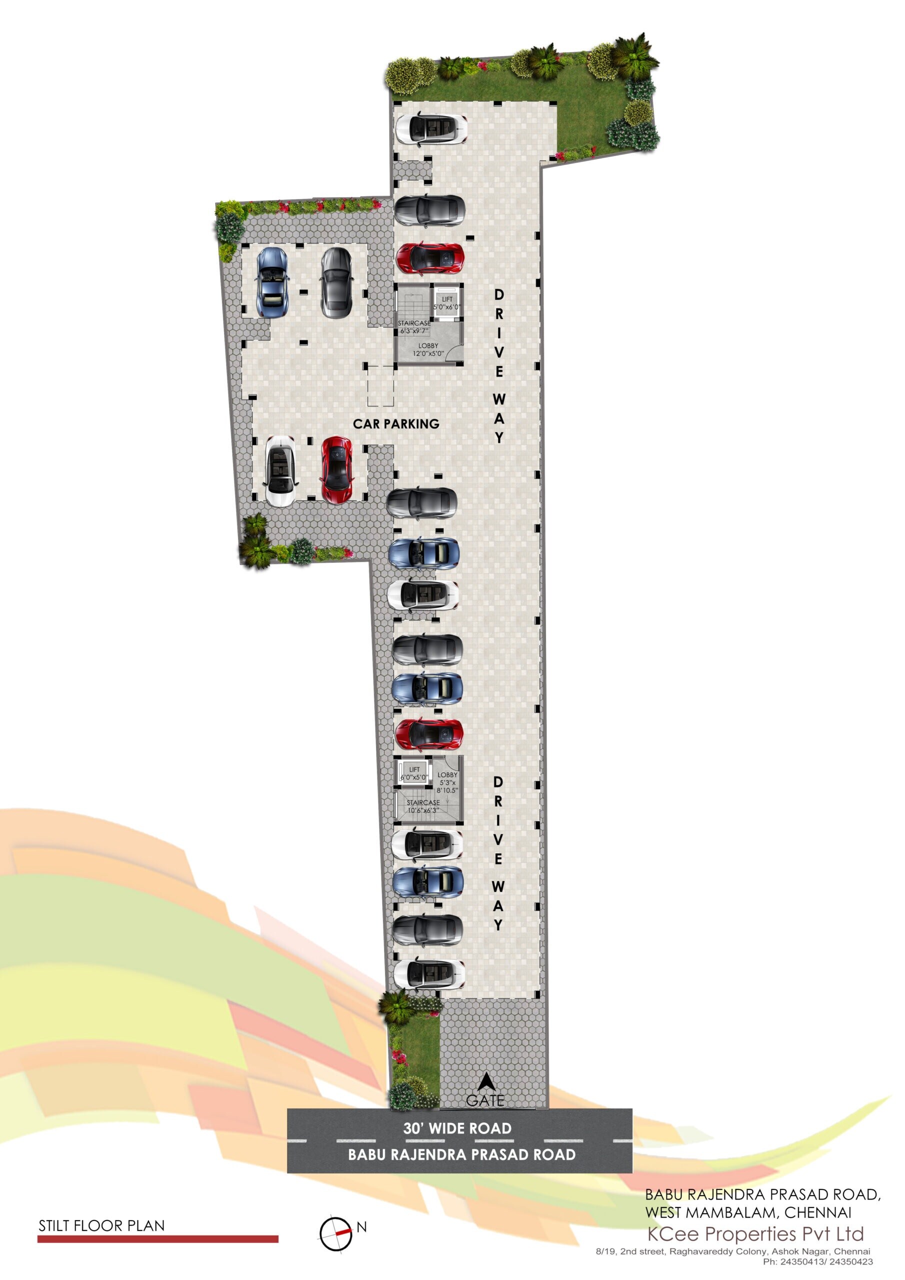 This is the master plan for KCee Niveditham, located on Babu Rajendra Prasad Road in West Mambalam, Chennai. This stilt floor plan primarily details the parking and access areas for the building above. Details on the total land area, number of units, towers, launch, or completion dates are not visible in this plan.