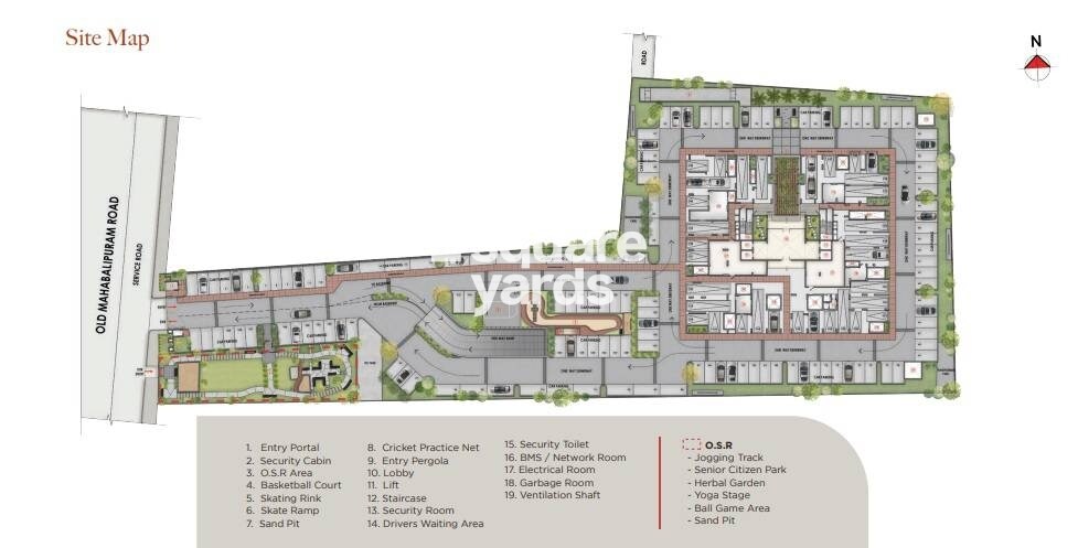 Nutech Elevate 21 is a project located in Thiruvanmiyur. This master plan illustrates a development featuring a single primary building structure surrounded by various amenity and open spaces. Specific details regarding total land area, number of units, number of towers, or project launch and completion dates are not provided within the visible plans.