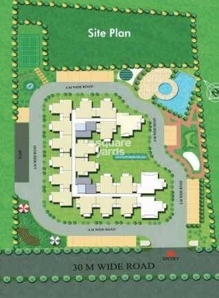 The site is primarily allocated for residential use with several multi-story buildings, extensively surrounded by landscaped green areas. A significant portion of the plan is dedicated to open green spaces and recreational facilities.