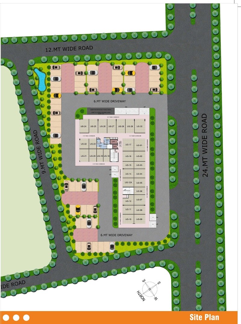 The master plan designates areas for residential buildings, internal vehicular access, and extensive landscaped green spaces. A small water body is also incorporated into the green space in the upper-left quadrant of the property.