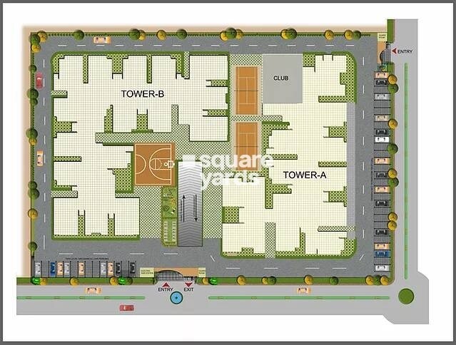 The development efficiently utilizes its land for residential purposes, featuring two distinct towers, Tower-A and Tower-B. Significant areas are also dedicated to recreational facilities and open green spaces.