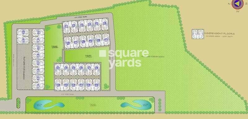 The land use is primarily residential, focusing on independent floor units. There are significant green open spaces integrated throughout the plan, providing a spacious environment. We haven't specified units per acre or exact land use percentages on this overview, but you can see a balanced approach between built-up areas and green cover.