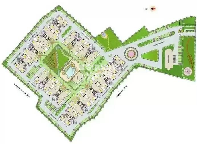 The development primarily features residential blocks, seamlessly integrated with substantial open green spaces, internal road networks, and dedicated amenity zones.