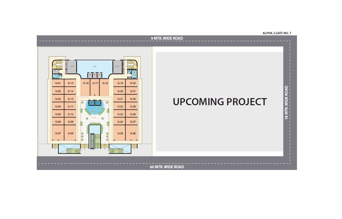 ALPHA 2 GATE NO. 7 is a commercial development located in Alpha II Greater Noida. This project features a single building structure comprising 44 ground-floor units, identified as G-01 through G-32, and G-05 through G-10, G-23 through G-28. The master plan also prominently displays a significant adjacent land parcel designated for an 'UPCOMING PROJECT,' indicating future expansion or development within the vicinity.