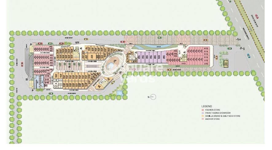 The master plan primarily details a commercial retail complex. The property features distinct zones designated for Fashion Stores, Front Facing Showrooms, Vanilla Brand & Daily Need Stores, and larger Anchor Stores, as identified in the legend. The complex is integrated with significant green spaces and tree-lined perimeters.