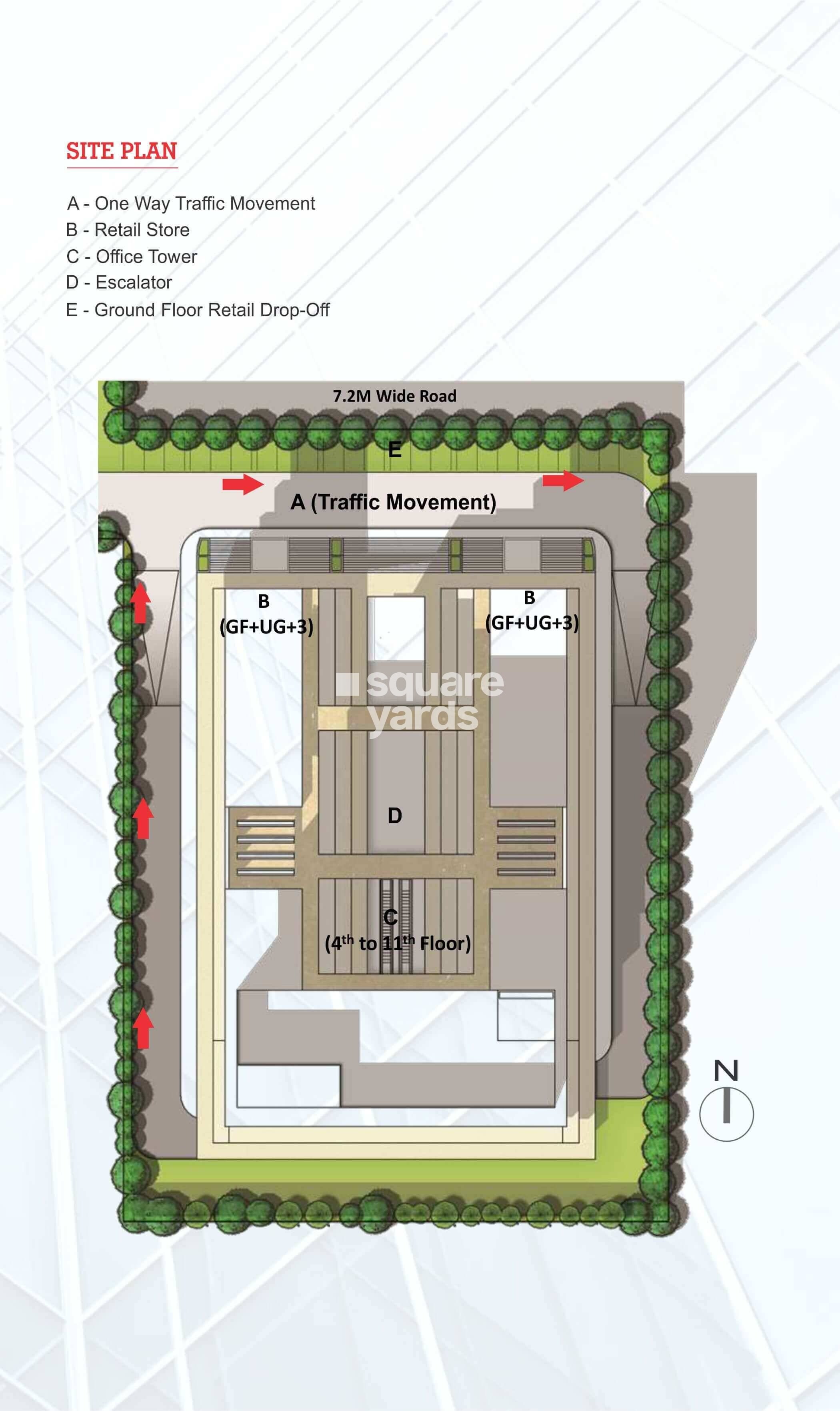 The project offers office spaces and retail shops in various configurations, including 225 Sq. Ft. and 350 Sq. Ft. office spaces and 200 Sq. Ft. retail shops.