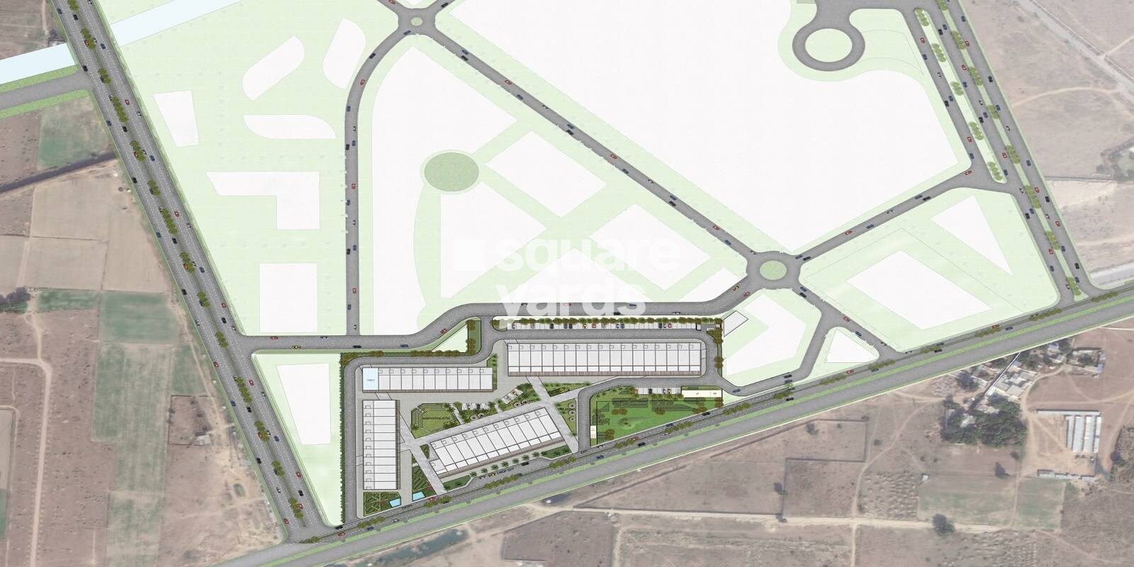 The master plan prominently features a centralized, structured complex composed of multiple grid-like building blocks, suggesting a designated zone for business or commercial activities. This core developed area is integrated within a wider plan that includes an extensive road network, surrounded by large expanses of undeveloped land or green fields.