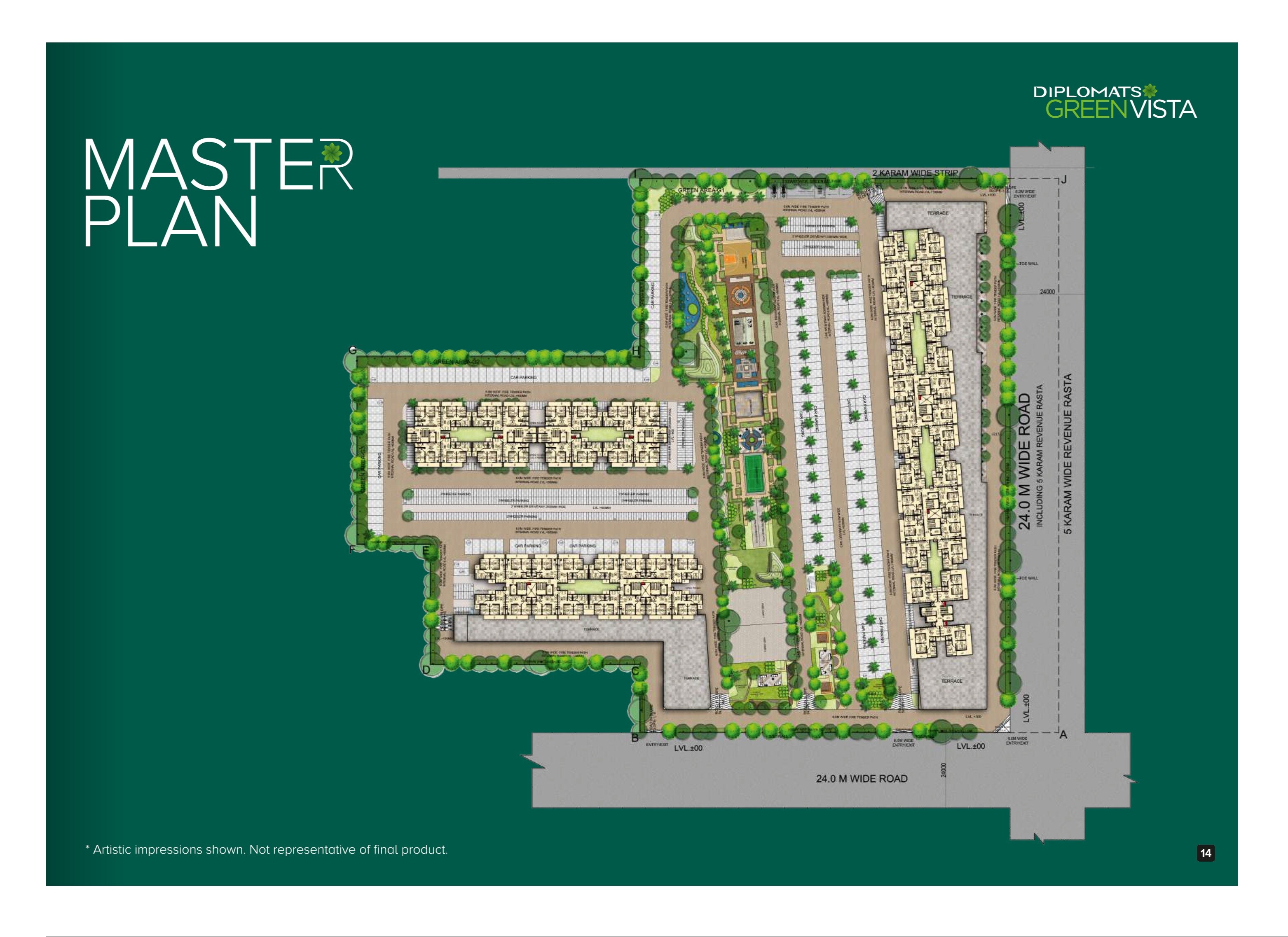 The development is primarily designated for residential use, featuring multiple apartment blocks alongside extensive open green spaces and dedicated car parking zones. The master plan also incorporates an internal road network designed to connect these various functional areas within the property. Specific allocations or percentages for these zones, or units per acre, are not indicated on the plan.