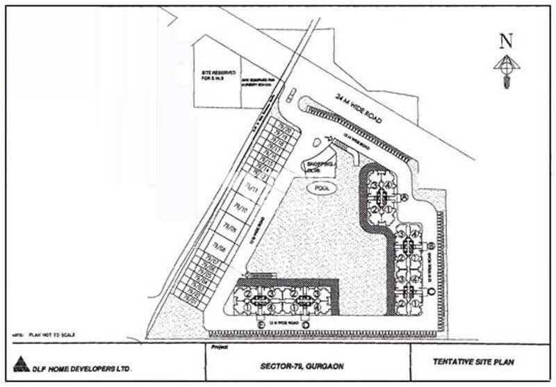This master plan for DLF Express Towers, located in Sector 79, Gurgaon, outlines a mixed-use development by DLF Home Developers Ltd. The plan features a combination of residential plots and multi-unit residential blocks, alongside commercial and institutional areas.