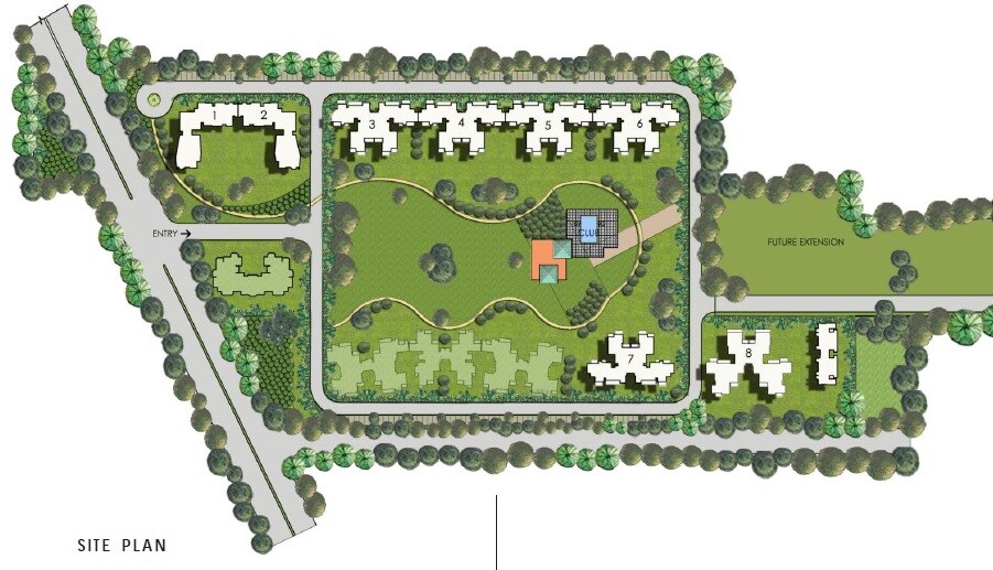The development primarily features residential tower clusters integrated with extensive green open spaces. A significant portion of the plan is dedicated to landscaped areas, including a large central park. An area for future expansion is also demarcated on the eastern side of the property.