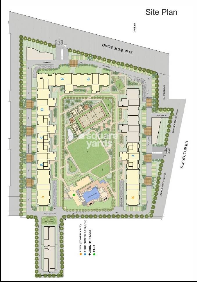 This master plan presents a residential development featuring 9 towers in total. We have 2 towers, A and K, that offer 3 BHK configurations. The remaining 7 towers, B, C, D, E, F, G, and J, are all designed with 2 BHK units.