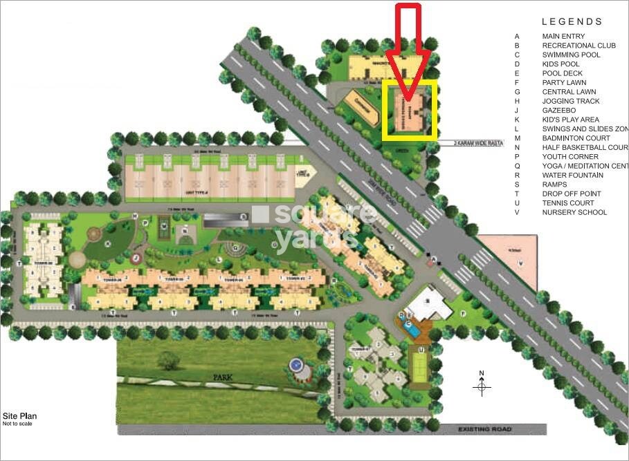 Satya Platina is located in Sector 103, benefiting from external connectivity to Dwarka Expressway, which is 1.5 km away. The master plan shows four main residential towers and additional rows of residential blocks. The total land area, exact number of individual units, and project launch or completion dates are not indicated in the provided master plan.