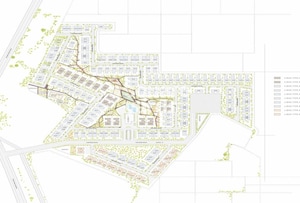 The master plan allocates space for residential villas, integrated with dedicated green areas like parks and gardens, and a central amenity zone. Residential units are clustered into distinct types varying in size and layout across the property.