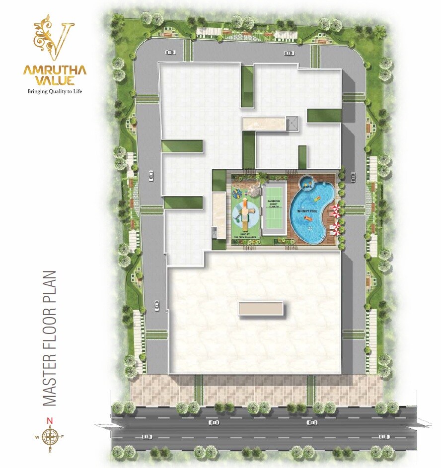 The master plan for Amrutha Value visually presents a residential development. Details regarding total land area, number of units, specific number of towers, or project launch and completion dates are not visually presented on this master plan itself.