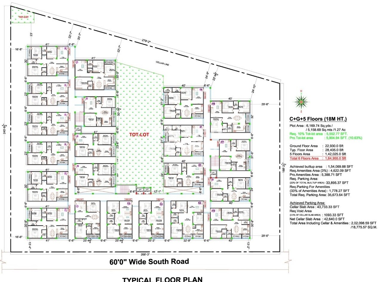 The master plan designates open space for a Tot-lot, providing 5,904.94 SFT, which surpasses the required 10% of the plot area, specifically 5,552.77 SFT (10.63% provided). This translates to approximately 78.7 units per acre based on the typical floor unit count.