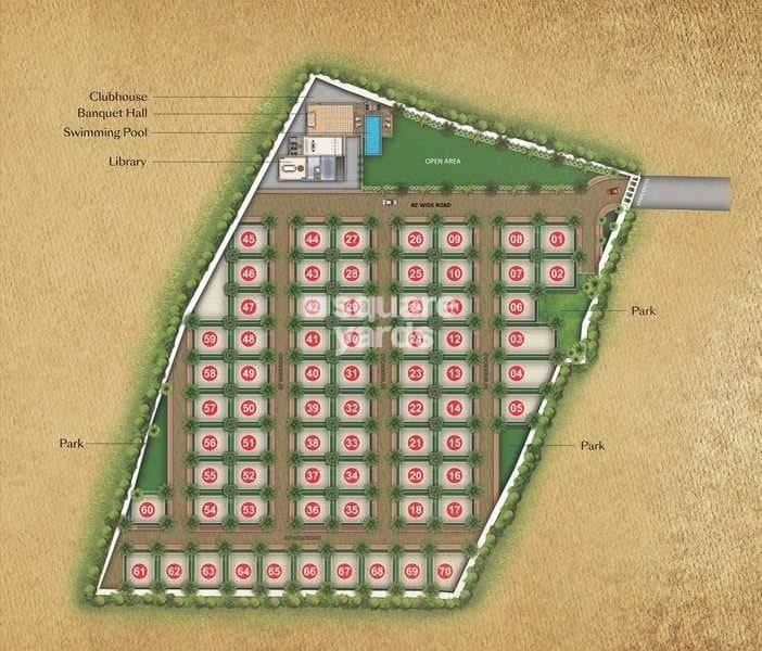The development is primarily residential, consisting of 70 plots numbered from 01 to 70. It includes dedicated areas for a clubhouse, several parks, and an open area. The layout suggests a focus on green spaces integrated within the residential plots.