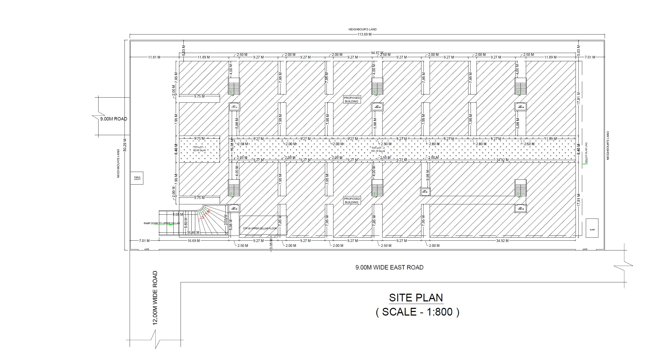 The master plan allocates significant space for two distinct 'PROPOSED BUILDING' structures, indicating the primary residential or commercial zones. For recreational purposes, we've included two 'TOT-LOT' areas: one sizable area spans 531.15 Sq.mt, and another smaller one covers 62.43 Sq.mt, providing dedicated open spaces within the property.