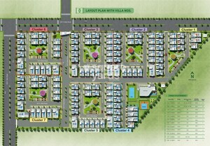 The master plan is organized into seven distinct residential clusters, labeled Cluster 1 through Cluster 7, with dedicated green spaces and recreational areas integrated throughout the layout.