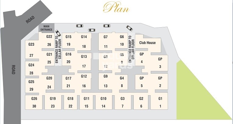 The master plan primarily designates space for residential units (G1-G26), with specific areas allocated for Ground Parking (GP) units. A centrally located Club House serves as a key amenity, while a significant portion of the property's eastern side is reserved as green space. Internal roads and access ramps facilitate movement within the development.