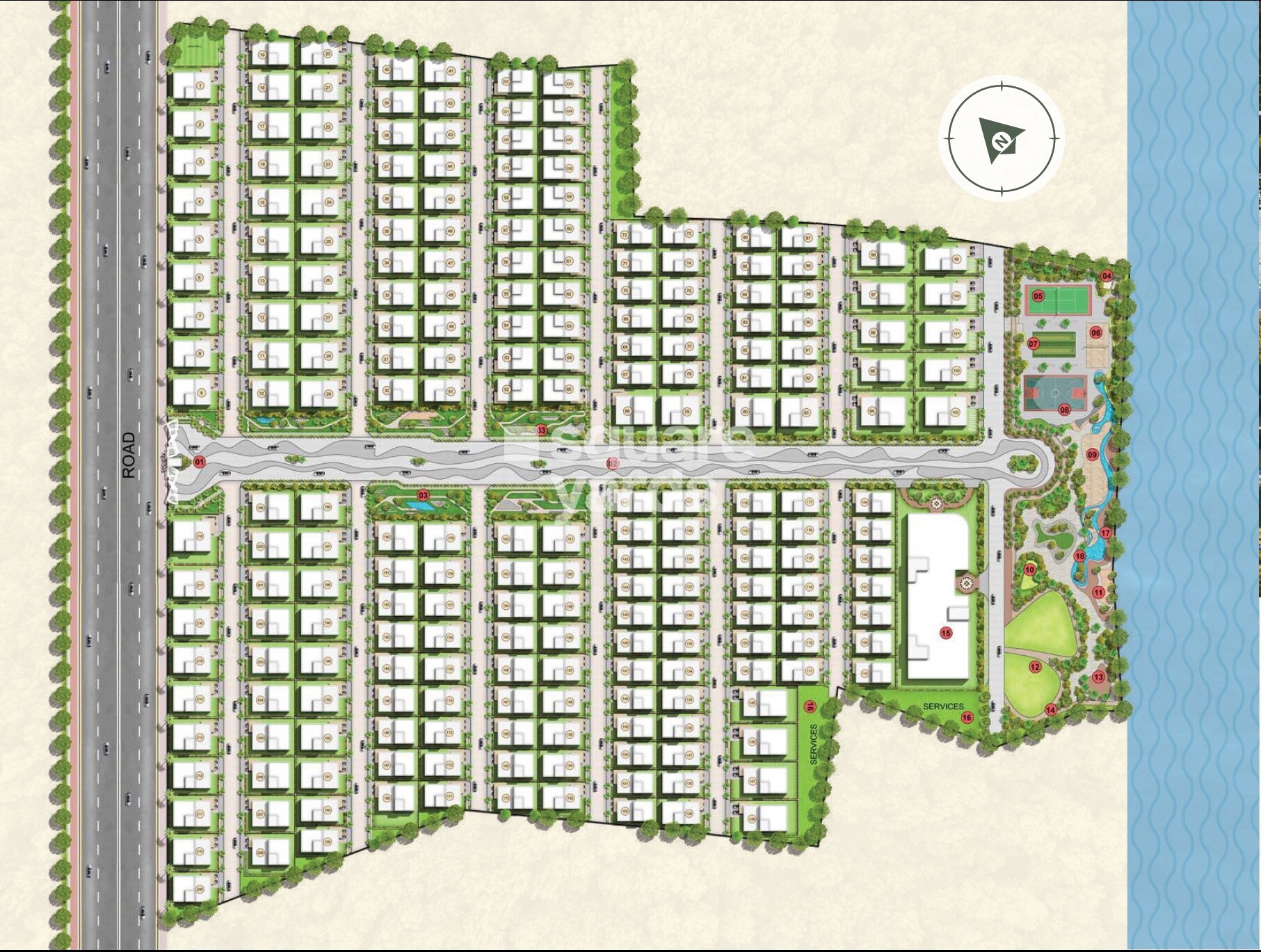 The master plan primarily designates land for residential use, featuring numerous individual plots for villas. A significant portion of the eastern side of the development is dedicated to open spaces and amenities, adjacent to a water body. Two distinct areas are designated for services within the development.