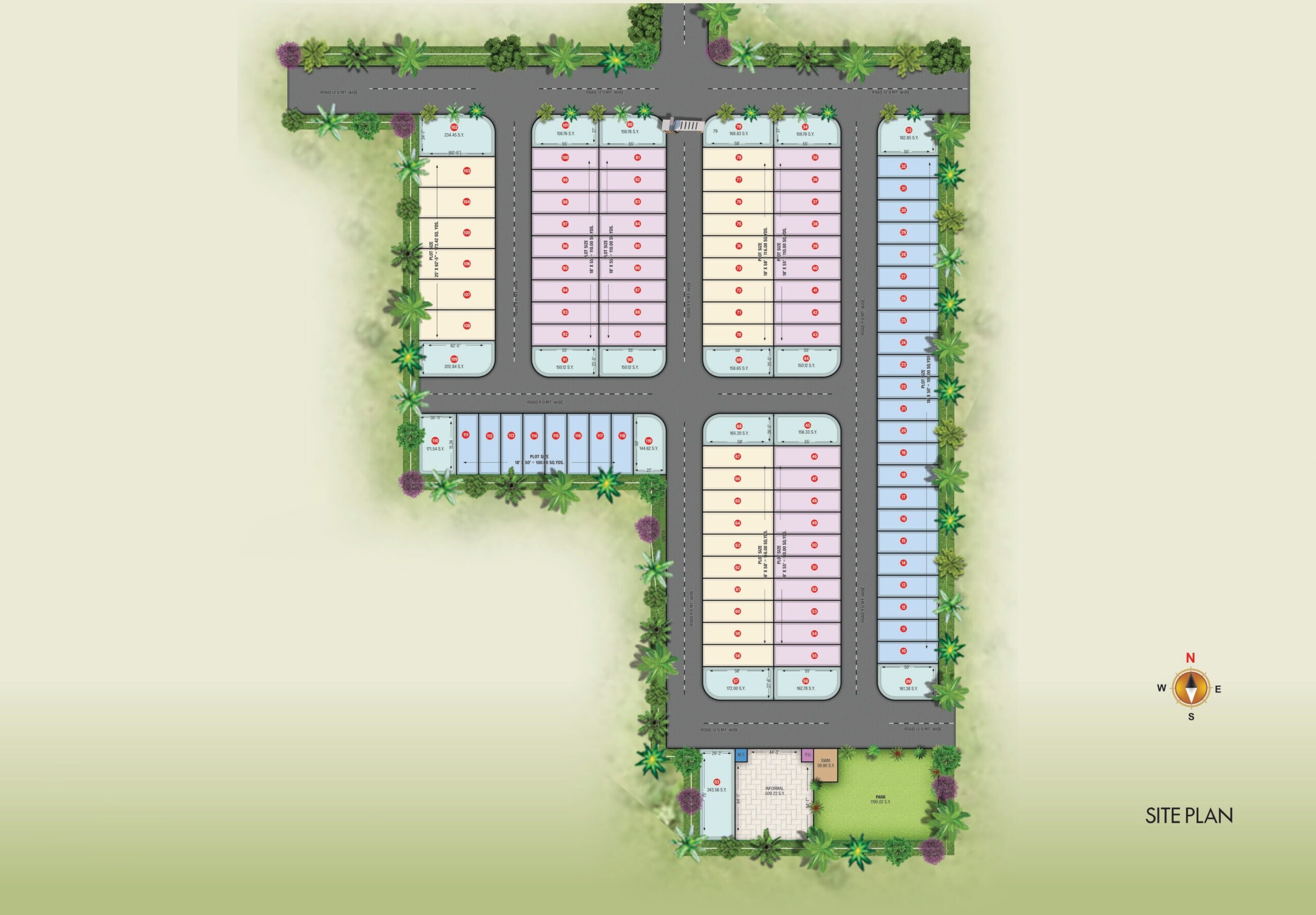 The development dedicates areas for residential plots, an extensive internal road network, a central park, and essential public utilities. A significant portion of land is allocated for a park, measuring 1190.02 square yards. There's also a designated area for Solid Waste Management (SWM) spanning 59.80 square yards, and an 'Informal' open space of 509.22 square yards, alongside other public utility zones.