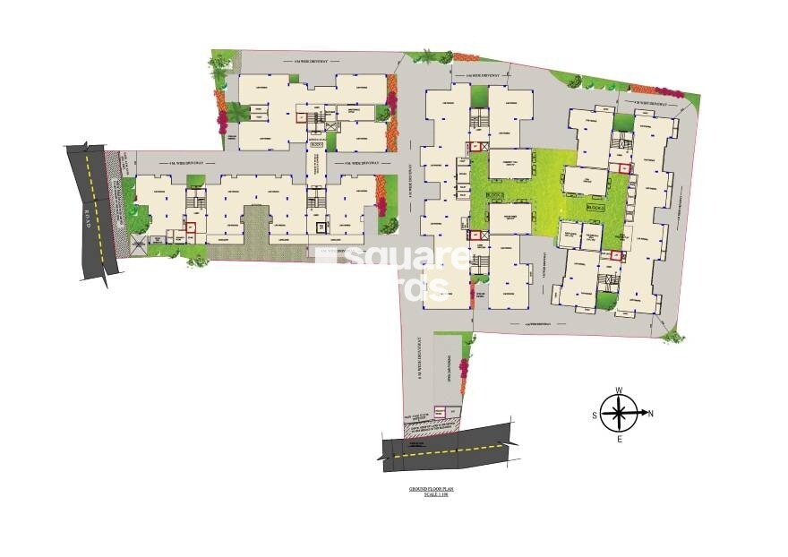 The property is designed with residential blocks strategically positioned around communal green spaces and an internal road network. This layout creates a balanced environment integrating living areas with accessible open spaces.