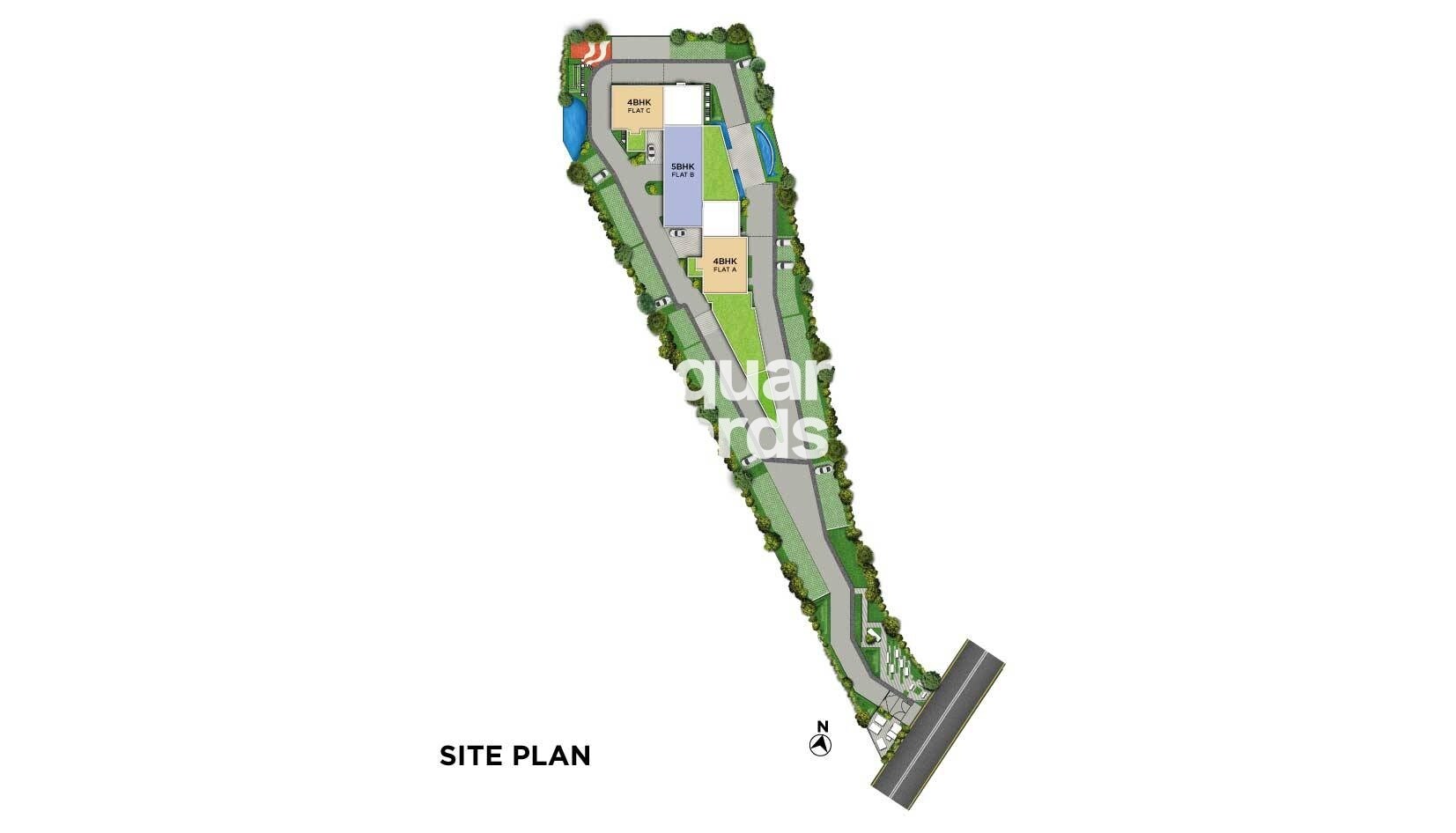 The property’s land use is primarily residential, featuring the three distinct flats. It includes significant landscaped green spaces and an internal paved access network. An external road provides primary access to the property. Specific land allocation percentages or unit densities per acre are not detailed.