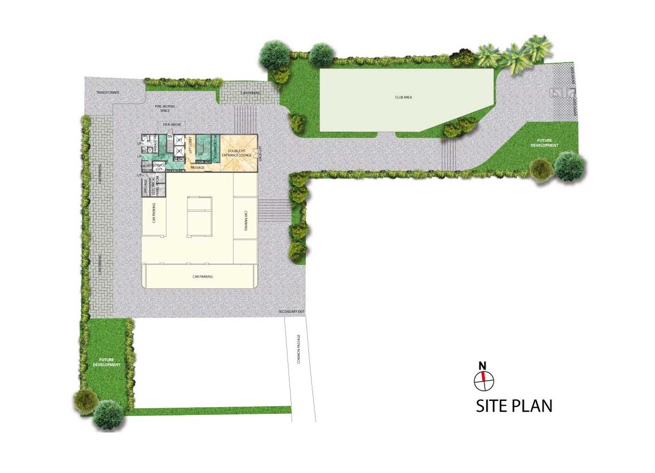 The layout primarily allocates space for a dedicated club area, a grand entrance lounge, and extensive car parking facilities. The plan also includes designated areas for future development and green spaces. Information on units per acre is not available in this site plan.