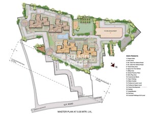 This master plan presents Rishi Pranaya Phase I, a residential development featuring four distinct towers: Tower 1, Tower 2, Tower 3, and Tower 4. The entire plan is detailed at the 0.00 MTR. LVL.