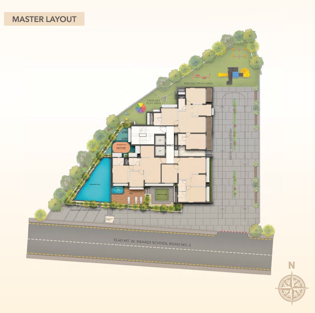 The development is primarily residential, with Wing C forming the central dwelling area. Surrounding this building are designated open spaces featuring landscaped green areas, dedicated children's play zones, and a pool complex. Utility areas, such as the security cabin, are also integrated into the layout. No specific land allocation percentages or density figures are visible.