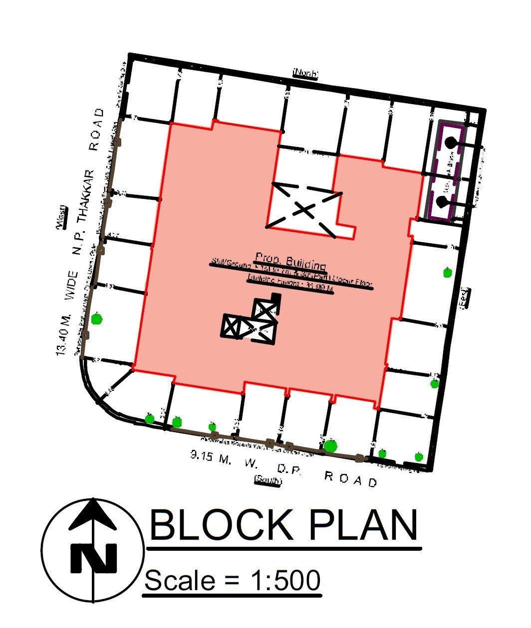 The primary land use shown is for the Proposed Building, shaded in red, which defines the construction footprint. The surrounding areas are dedicated to public road networks.