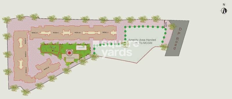 The master plan primarily designates space for residential use, featuring WING A, WING B, WING C, WING D, and WING E arranged linearly. Significant open green spaces and landscaped areas are integrated throughout the development, with a clearly marked 'Amenity Area Handed over To MCGM,' indicating a portion dedicated to public or community use. No specific commercial zones or units per acre figures are visible.