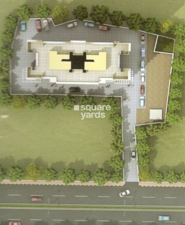 The master plan for Gokul Residency Dahisar primarily allocates space for a central residential building, surrounded by extensive green areas and dedicated paved surfaces for parking and vehicular access. Specific designated zones with percentages or units per acre are not detailed in this overview.