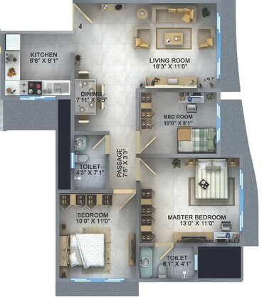 The apartments come with features like Master Bedroom with oil-bound distemper walls, vitrified tile flooring, and premium bath fittings.