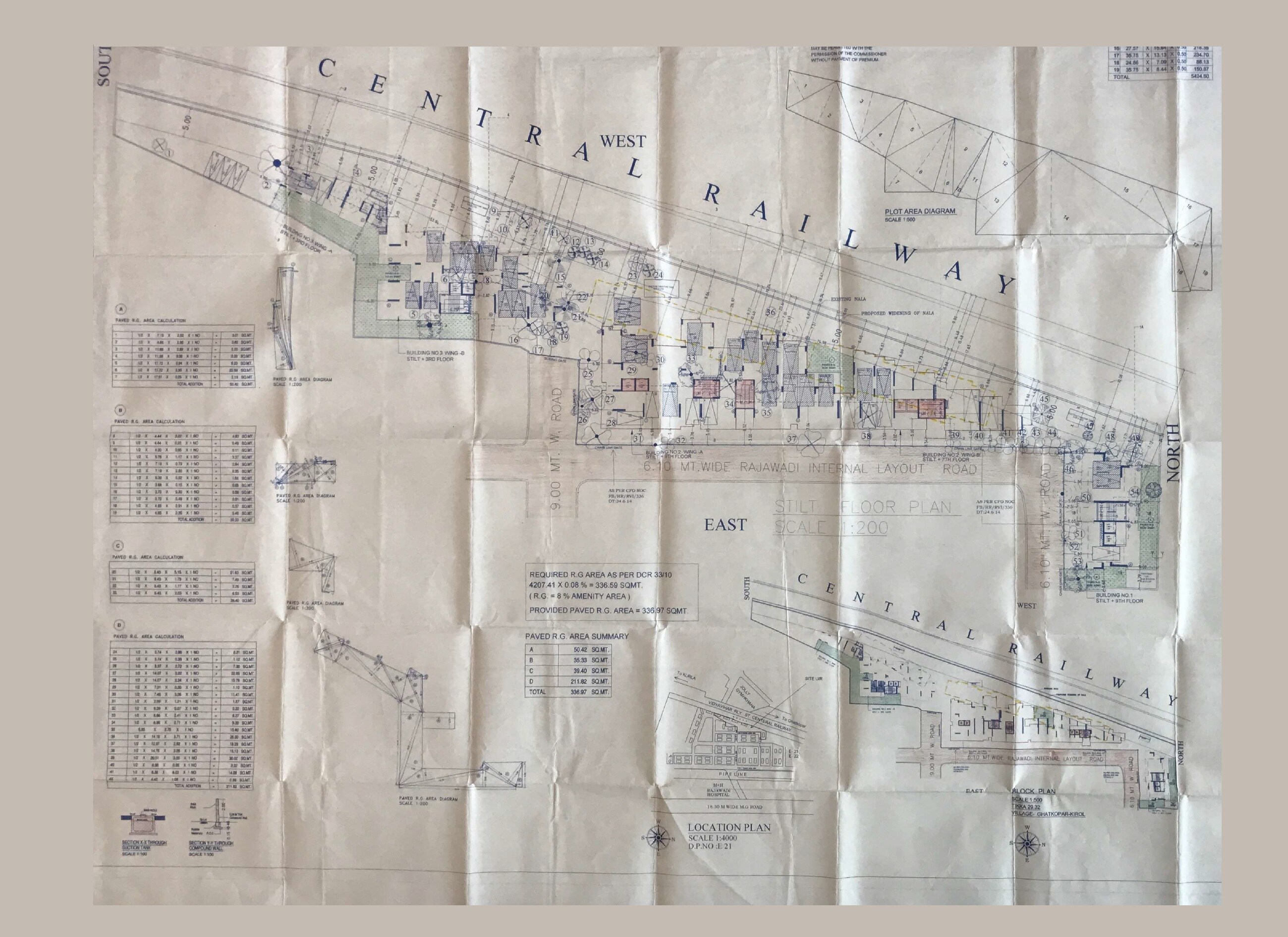 Welcome to Maithili Residency in Ghatkopar East. This master plan outlines a residential development, sanctioned as per CFO NOC FB/HR/RVI/336 dated 24.06.2014. The plot area considered for DCR compliance is 4207.41 square meters, featuring two primary buildings: Building No. 1 standing at Stilt plus 9 Floors, and Building No. 3, which comprises two wings (Wing-A and Wing-B), each at Stilt plus 3 Floors.