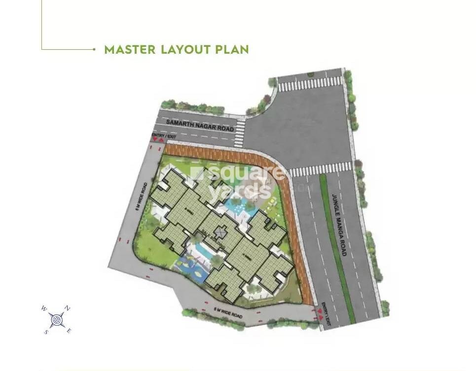 Maverick Wishvas is located in Bhandup West. While the total land area, number of units, and number of towers are not specified in this master plan overview, the layout shows a structured residential development.