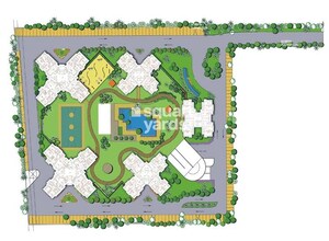 The development primarily features residential buildings, with substantial allocations for open green spaces, recreational areas, and a dedicated community facility. Large landscaped gardens and pathways integrate throughout the property.