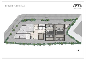 The ground floor plan for Rustomjee ADEN BKC ANNEXE primarily shows commercial spaces, parking facilities, and essential common areas. We have designated areas for multiple shops, two parking towers, an entrance lobby, and various utility rooms. Open spaces are allocated along the perimeter, featuring landscaped greenery.