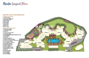 The development primarily features residential towers integrated with extensive landscaped open spaces and amenity zones. There are no explicitly labeled commercial areas within this master plan, with a significant portion dedicated to green areas and recreational facilities for residents.