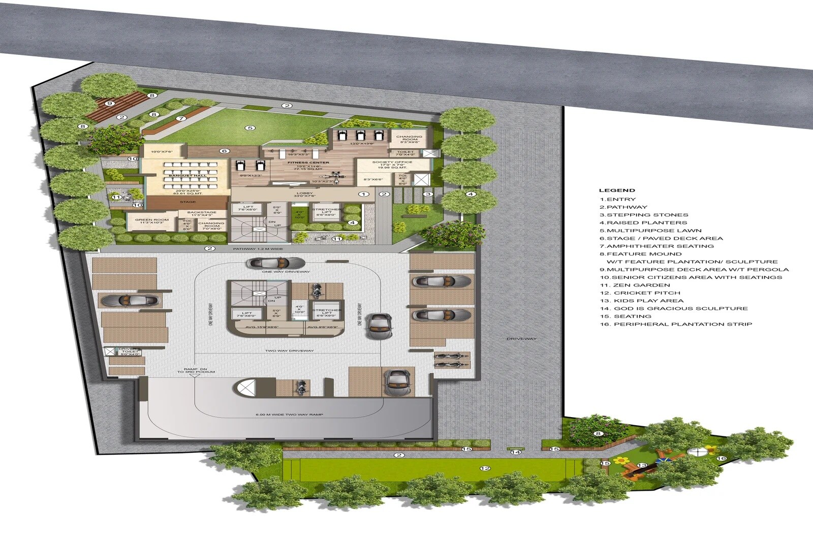 The master plan features a significant allocation to open and recreational spaces, including a Multipurpose Lawn, Raised Planters, a Zen Garden, a Cricket Pitch, and a Kids Play Area. Community facilities are centrally located, encompassing a Fitness Center, a Banquet Hall, and a Society Office, all integrated into a well-defined layout with designated pathways and peripheral plantation strips.