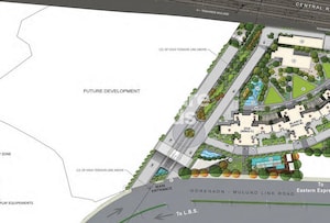 The master plan shows designated residential zones with the three wings, surrounded by extensive open spaces dedicated to various amenities. There's also an area marked for 'FUTURE DEVELOPMENT' adjacent to the property. Specific allocations or units per acre are not detailed.