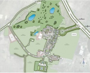 This master plan outlines a mixed-use development, thoughtfully integrating residential zones with dedicated areas for commercial, hospitality, and healthcare facilities. Significant portions of the land are earmarked as 'Future Development,' indicating planned growth. The design also incorporates extensive green open spaces, including landscaped areas and natural water bodies.