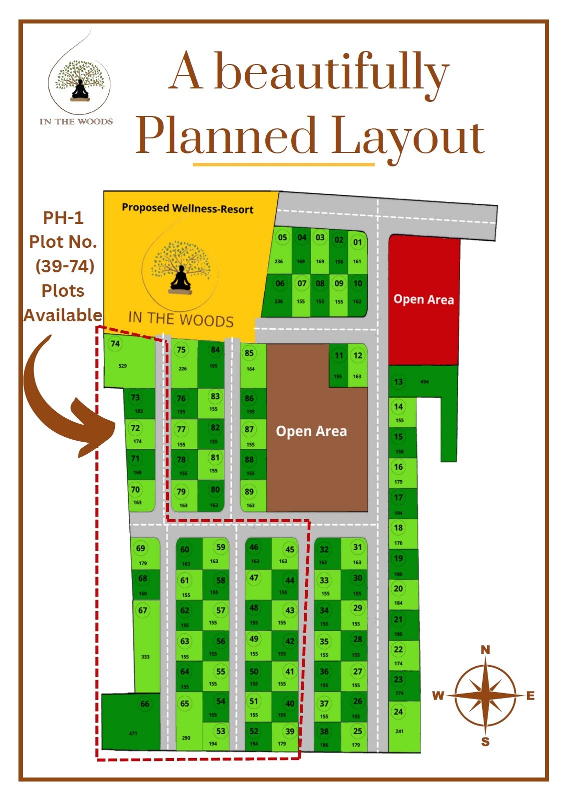 IN THE WOODS is a planned layout offering plots. This master plan details Phase 1 (PH-1), which includes plots numbered from 39 to 74, making 36 plots available in this phase out of 89 total plots shown in the layout.